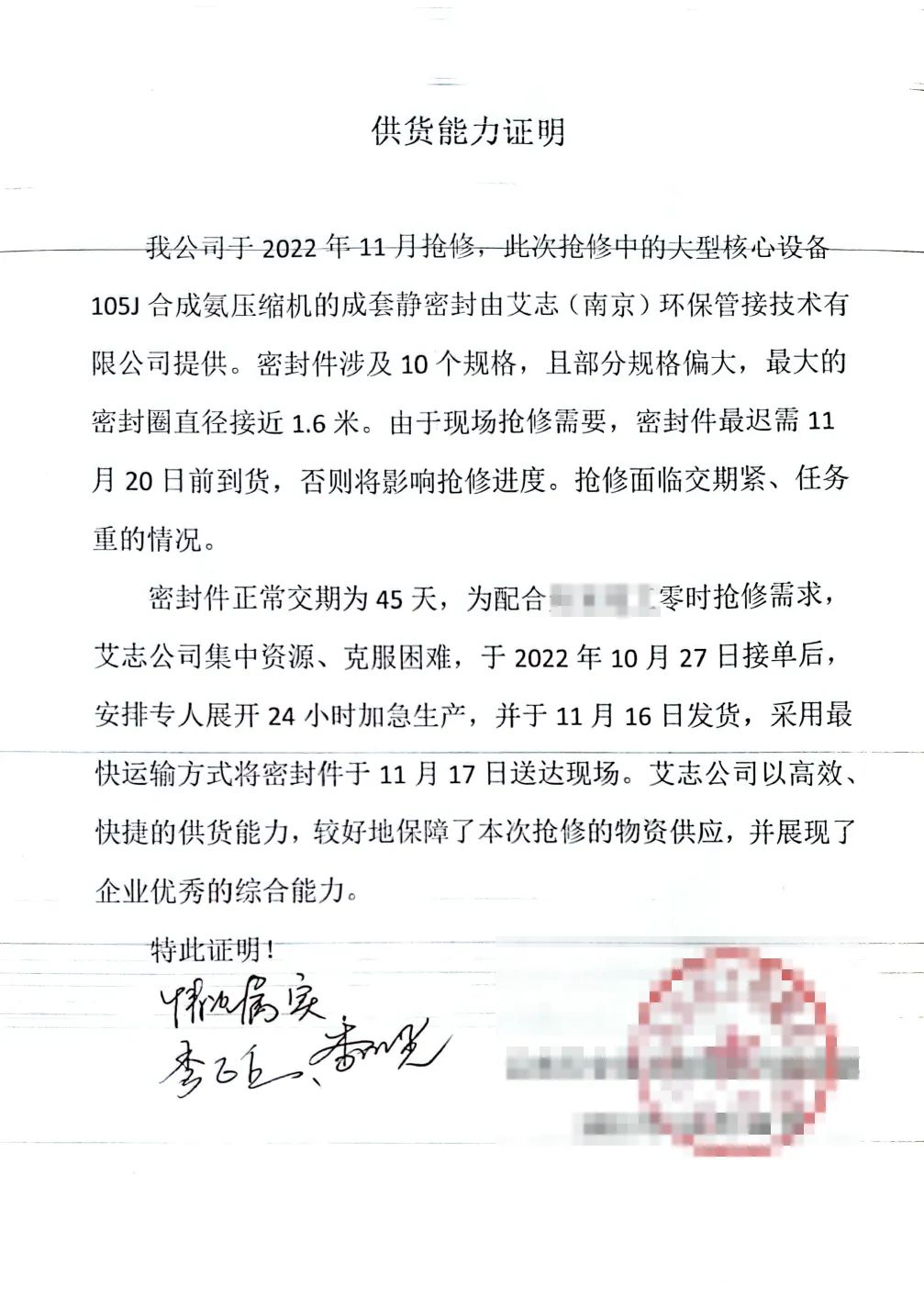 云南某大型化工企業(yè)于2022年11月上旬召開(kāi)了“敢于勝利,26天完成應(yīng)急搶修任務(wù)”的搶修動(dòng)員大會(huì)。此次搶修中的大型核心設(shè)備105J合成氨壓縮機(jī)的成套靜密封由我公司提供。