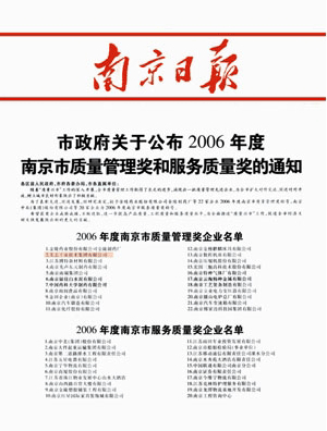 另外, 我公司榮獲由南京市人民政府頒發(fā)的“2006年南京市質(zhì)量管理獎(jiǎng)”。該獎(jiǎng)項(xiàng)是對(duì)卓越績(jī)效的評(píng)價(jià)和認(rèn)可,主要圍繞企業(yè)在質(zhì)量管理方面的一系列工作做出測(cè)評(píng), 是南京企業(yè)在質(zhì)量管理方面的最高獎(jiǎng)項(xiàng)和榮譽(yù).本屆獎(jiǎng)項(xiàng)的評(píng)審借鑒美國(guó)“馬爾科姆·波多奇國(guó)家質(zhì)量管理獎(jiǎng)”模式標(biāo)準(zhǔn),按“高標(biāo)準(zhǔn)、少而精、優(yōu)中選優(yōu)、寧缺毋 濫”的原則進(jìn)行,此次共有22個(gè)企業(yè)榮獲該獎(jiǎng)項(xiàng)。